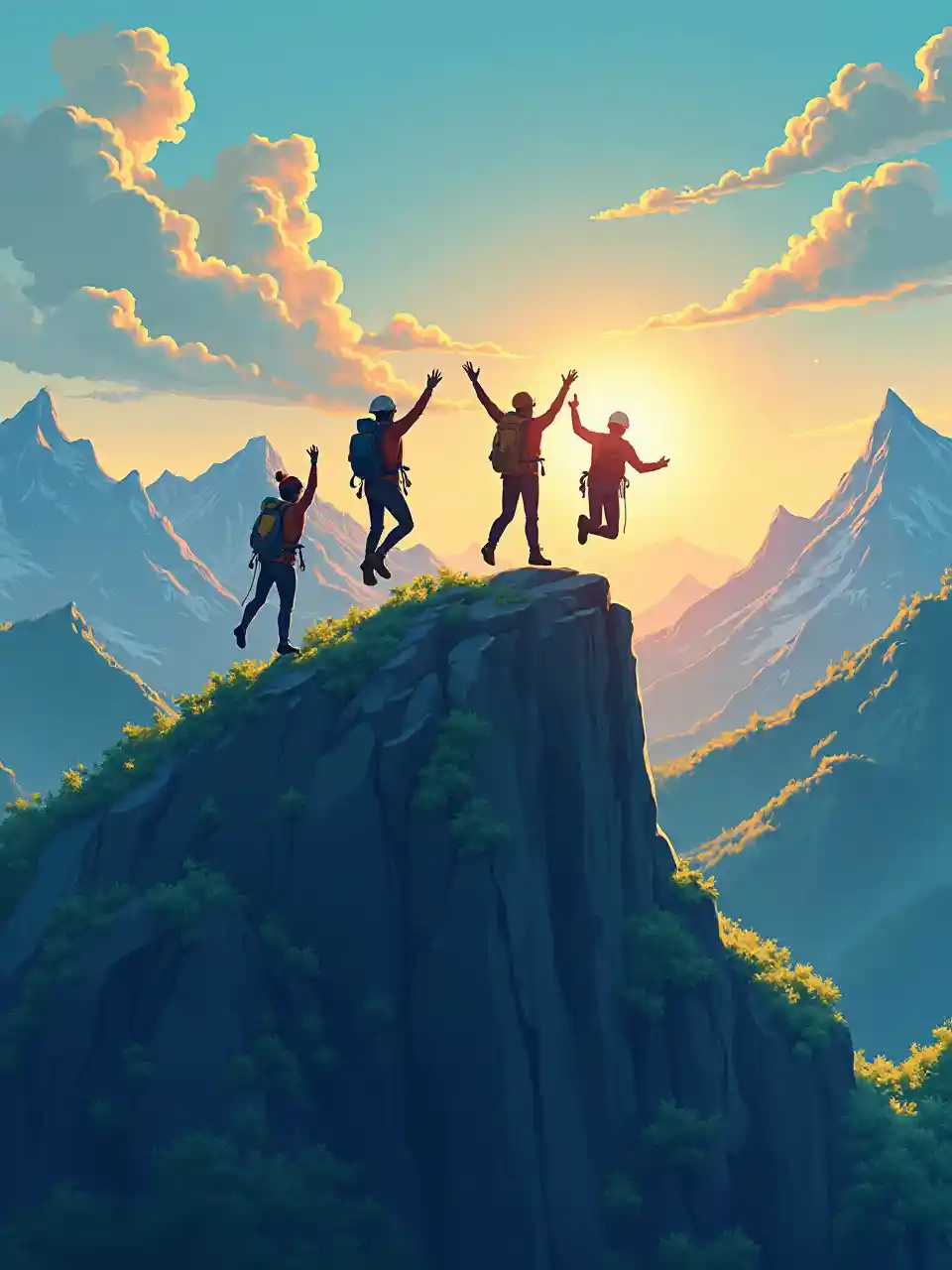 illustratie van een bergtop met 4 klimmers, close-up van. klimmers, klimmers die springen van vreugde, groen landschap, zonsondergang op de achtergrond, episch toneel, enkele cliuds, hoge belichting, zeer gedetailleerd, realistisch, levendige blauwe kleuren, uhd