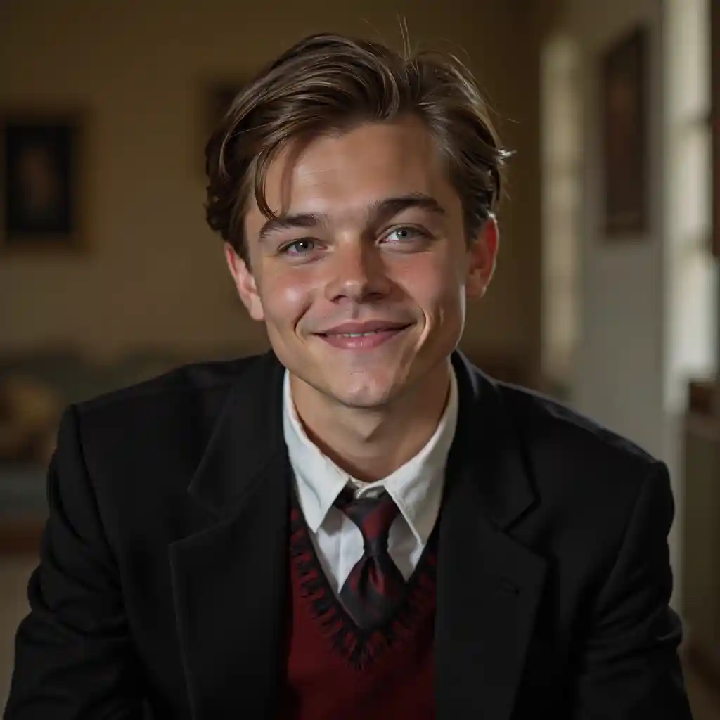 Leonardo DiCaprio is nog jong, rond de 18 jaar, draagt een zwart-rood oud geld school uniform, ziet er opzichtige en charismatische met een zoete glimlach