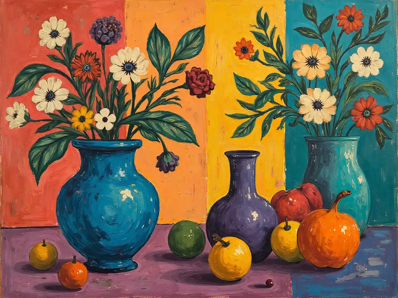 HenryEen Matisse-geïnspireerd stilleven schilderij met felle, vlakke kleuren en dikke penseelstreken die vazen met bloemen en fruit op een tafel.