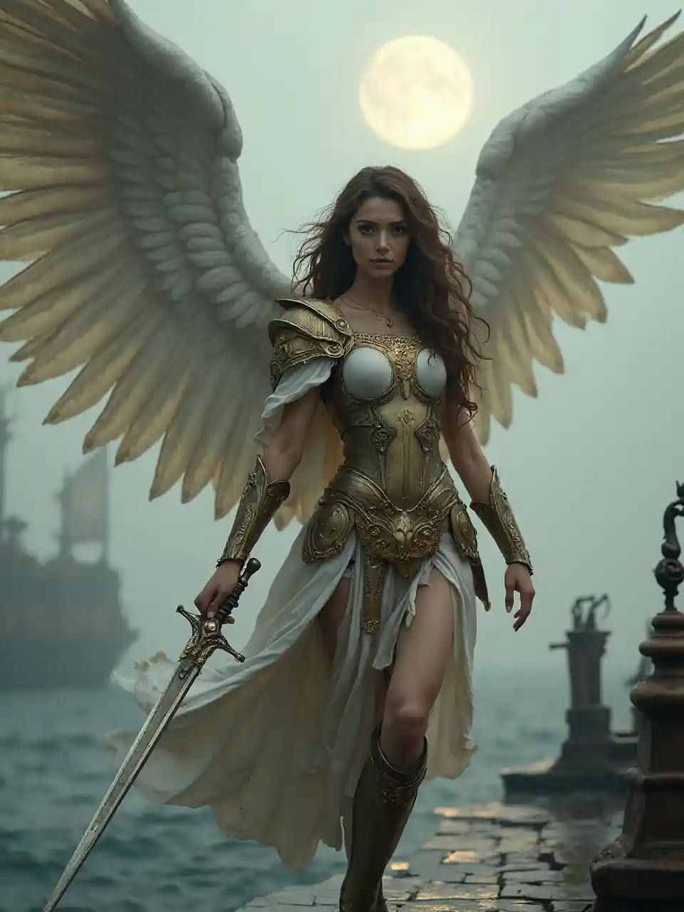 Vanuit een dynamische, extreem lage hoek, landt een mooi Midden-Oosterse mechangelist met overgrote ogen en lange, brede krachtige vleugels zacht op het dek van een oud schip dat een mistige oceaan bevaart, haar lange krullige bruine haar zachte make-up gedeeltelijk verdoezend, draagt een valkyrie-pant in brons en wit en een witte en gouden mantel, met een gedetailleerde achtergrond van het schip en de mist onder een licht maan