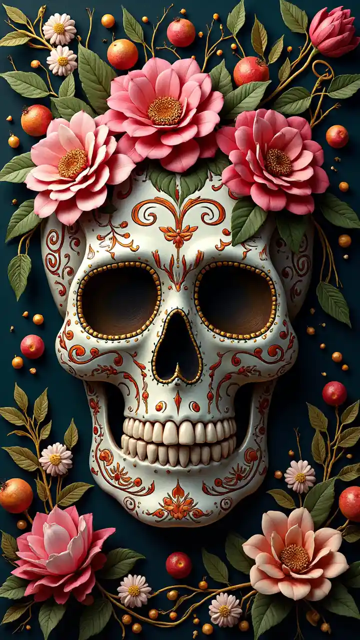 YamyMexicaanse schedel calavera, omgeven door poëtische sierlijke elementen zoals fruit, bloemen, lichten en inheemse planten, kleuren roze, groen, goud en zwart, 3D-stijl, zeer gedetailleerde, surrealistische