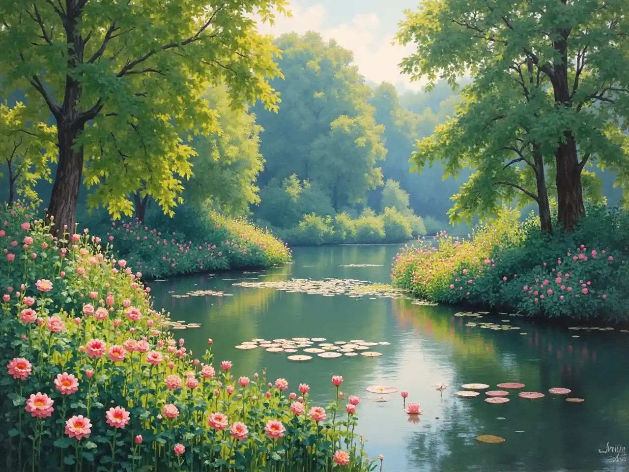 Een foto van een rustig landschap geschilderd door Claude Monet tijdens het begin van de Eerste Wereldoorlog, met weelderig groen, levendige bloemen en een rustige vijver met waterlelies. Het schilderij laat de schoonheid en de rust van de natuur zien in een tumultueuze tijd in de geschiedenis. Het gebruik van natuurlijk licht zorgt voor een zacht, wazig effect dat de randen van de bomen vervaagt en het schilderij een droom geeft. De samenstelling volgt de regel van derden, waarbij de vijver en de omliggende flora buiten het centrum zijn geplaatst. Geschilderd door de beroemde impressionist Claude Monet in 1914. De impressionistische penseelwerk- en kleurkeuze creëert een etherische, dromerige sfeer.