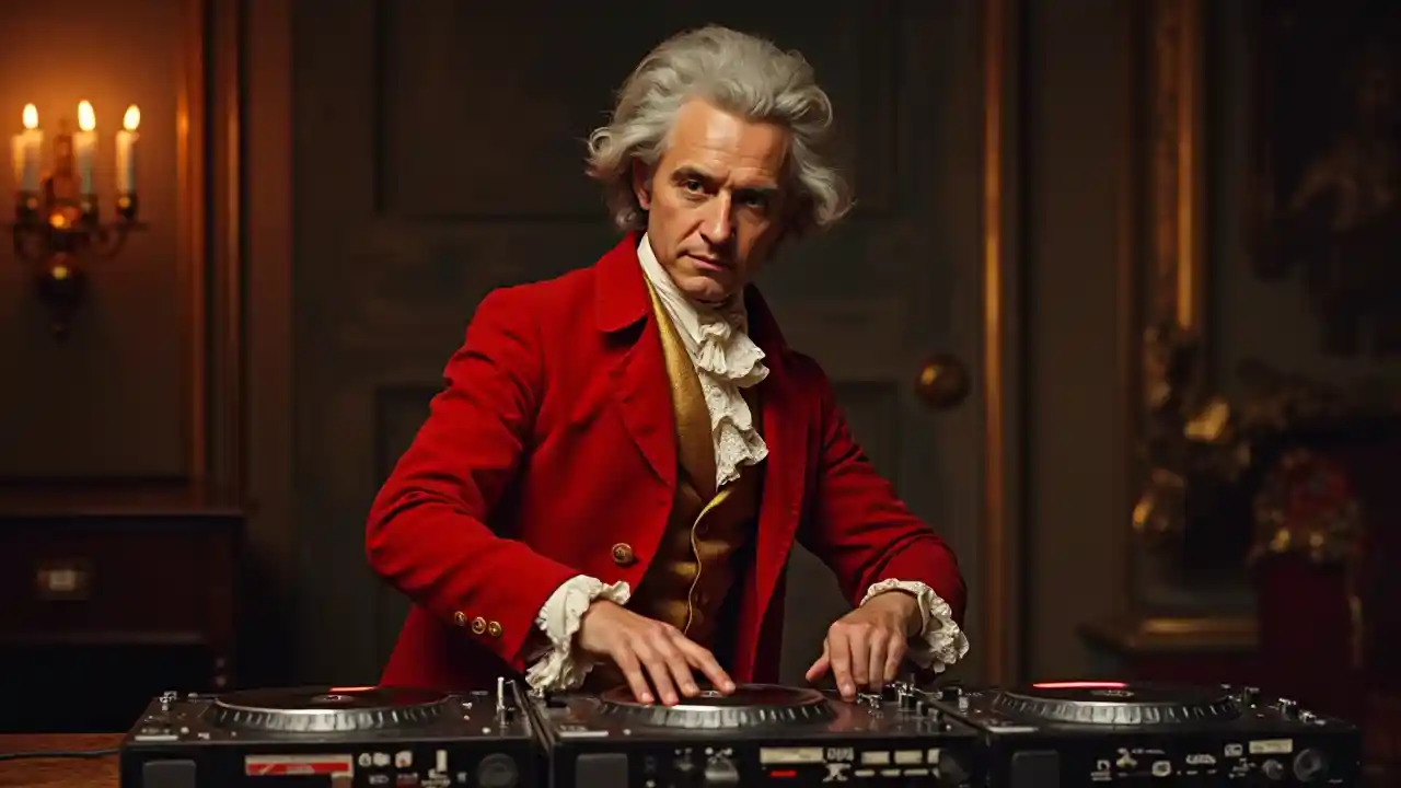 LucasWolfgang Amadeus Mozart in een rood pak uit de 18e eeuw, muziek maken op een dj tafel