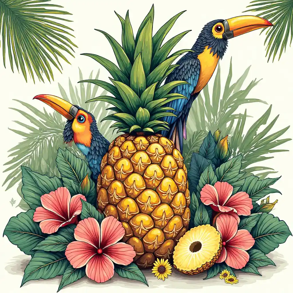 /tekenen De centrale en accentuerende plaats in de afbeelding moet worden ingenomen door het beeld van een ananas (geheel fruit, met stukken). Tropische sfeer van het Caribisch gebied. De illustratie moet een tropische sier gebruiken (bijvoorbeeld dichte vegetatie) In de illustratie kunt u afbeeldingen gebruiken van herkenbare tropische vogels (papegaai, toekaan, flamingo), bloemen, insecten, hagedissen, dieren, evenals tropische planten - palmbladeren, bloemen. de illustratie moet worden geïntegreerd met een schedel, als symbool dat op de gehele lijn van het merk wordt afgebeeld.