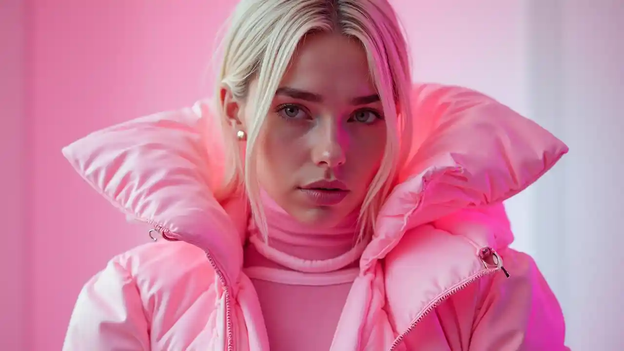 Een mooie blonde vrouw, allemaal roze, slanke futuristische harnassen, latex laarzen, schone make-up, met scherp beeld, fantastisch scherp en koninklijk thema outfit, gevangen in levendige kleuren, belichaamt de essentie van fantasie, minimalist
