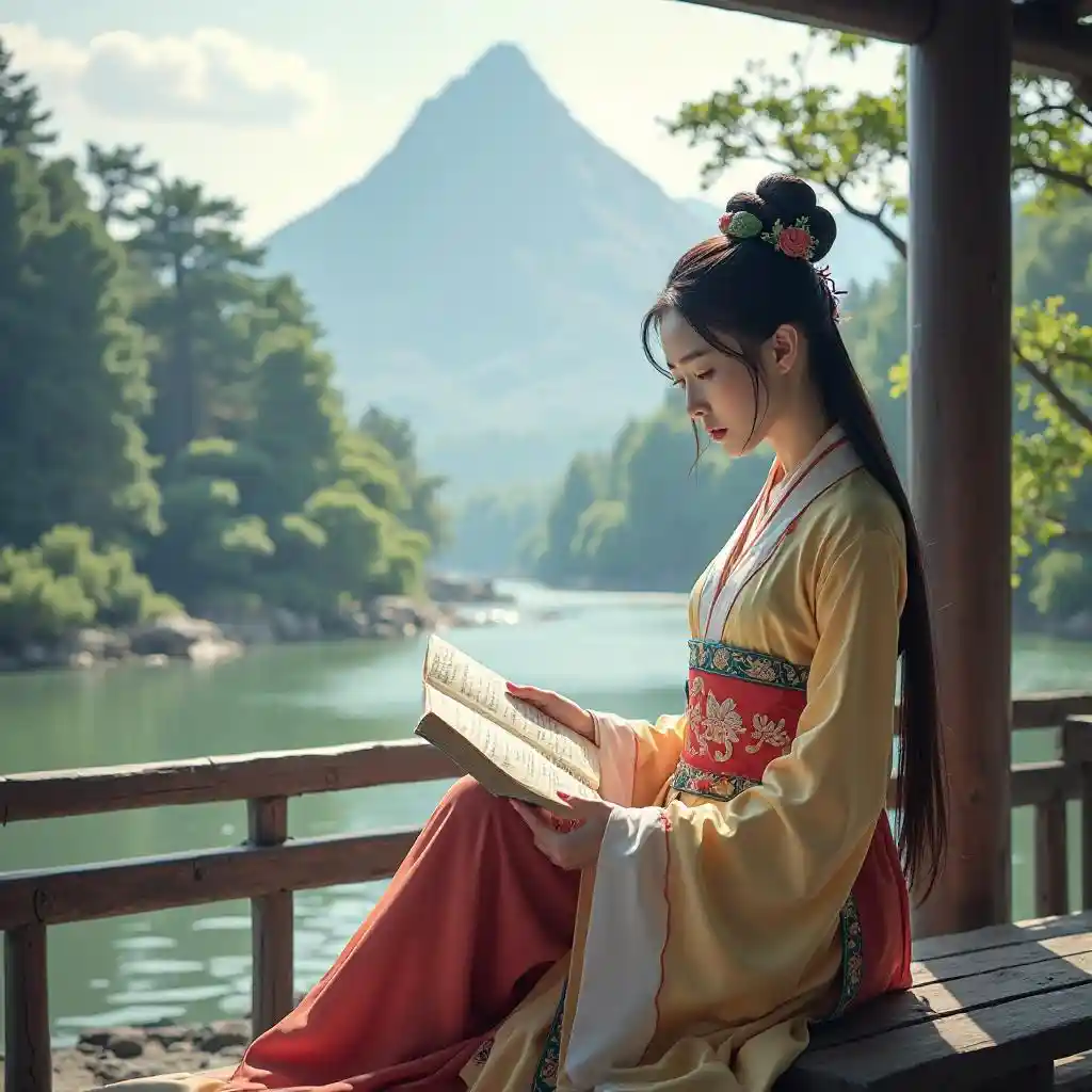 Een mooie Chinese dame met een mooie oude kleding uit de Tang-dynastie, zit in een paviljoen naast een rivierpark, achtergrond is een hoogste berg met verspreide dennen, de dame leest een Chinees gedicht en denkt een tijd.