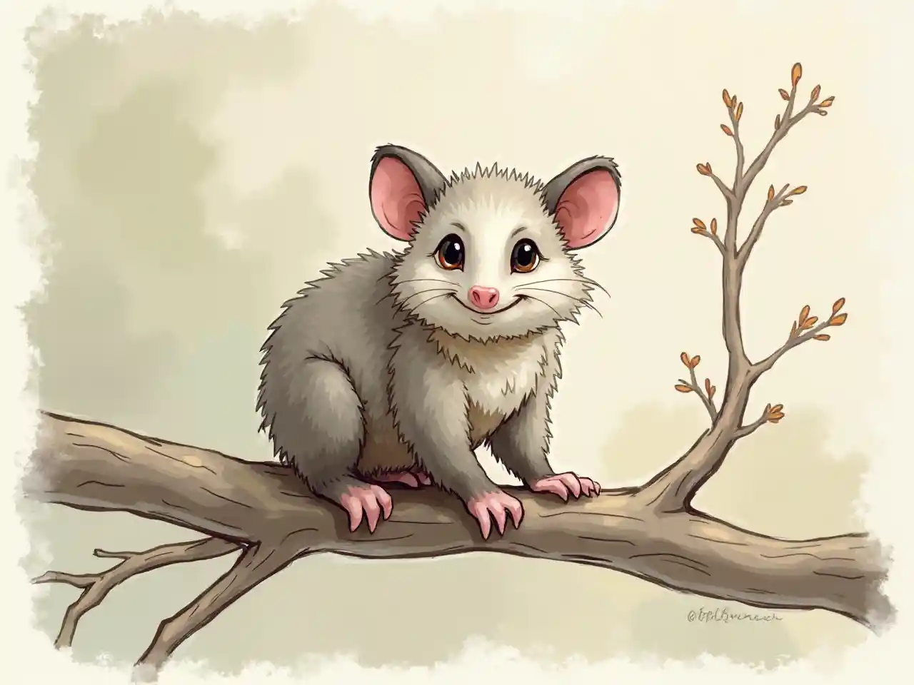 QinxueConcept Art, schattig opossum op een tak, snelle schets in verschillende variaties
