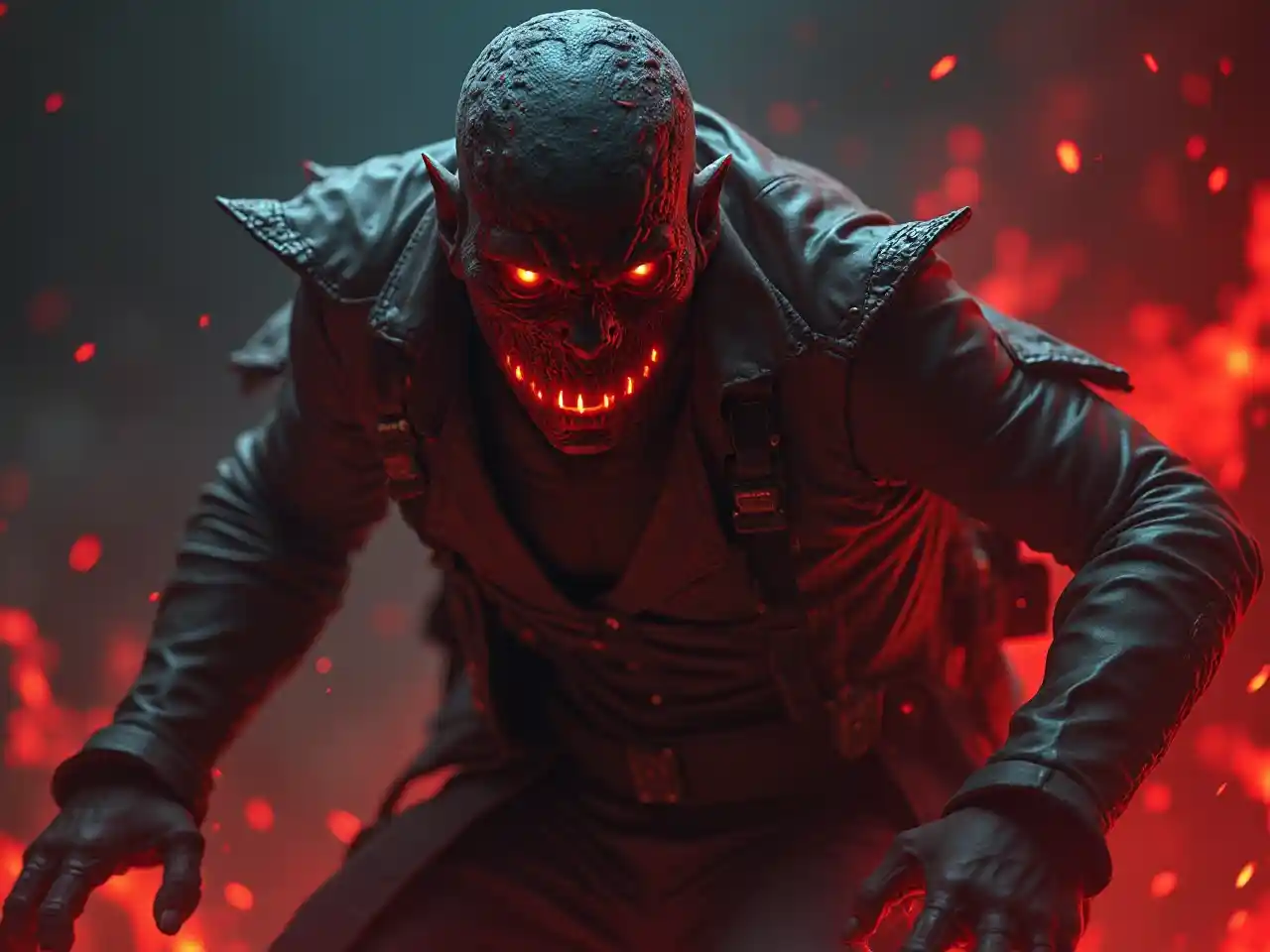 De ogen van het personage beginnen te gloeien in een angstaanjagend rood en hij kruist de armen, klaar om te vechten