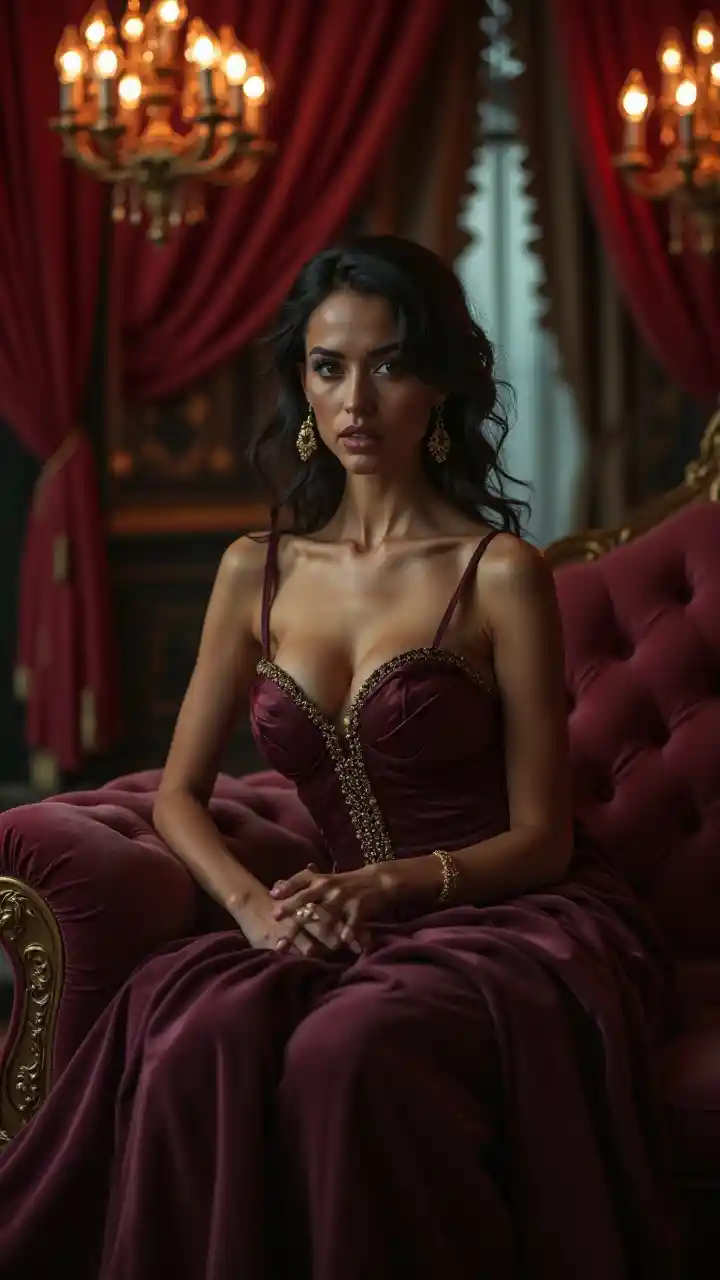 Poseren op een fluwelen stoel in een gotische balzaal, een Midden-Oosterse vrouw in haar 35s, in een korset. Kandelaars en karmoze gordijnen omringen haar, haar gebogen borst en slanke benen worden benadrukt, uitstralen koninklijke allure en verleidelijke balans in een op, romantische omgeving.