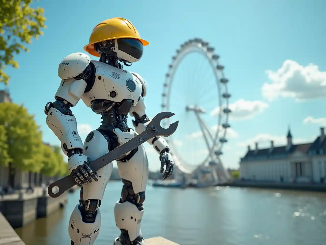 (photorealistic) tilt shift photo of a giant white & yellow robot wearing a hard hat and holding a huge wrench, standing next to the London Eye on the Thames River, vibrant blue sky, bright sunny day, intricate details of iconic structures, shimmering water reflections, lush greenery in the background, dynamic perspective, capturing the essence of London, (8K), ultra-detailed, professional photography techniques, inviting and clear atmosphere, perfect for showcasing the heart of England.