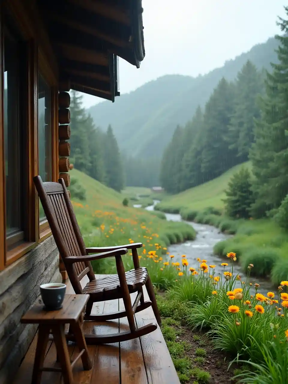 Een realistische, groothoekscène van een houten schommelstoel op een kleine veranda op een blok hut. Naast de schommelstoel zit een kleine houten tafel met een kop koffie erop. De lucht is bewolkt terwijl de regen valt in de afgelegen vallei van de Appalachen. Een beek buigt zich en buigt zich door de vallei en voorbij de veranda van de blokhut geeft een prachtig en vredig uitzicht. Er bloeien wilde bloemen van verschillende heldere kleuren door de vallei. De scène is in 8K, extreem gedetailleerd en van de hoogste kwaliteit.