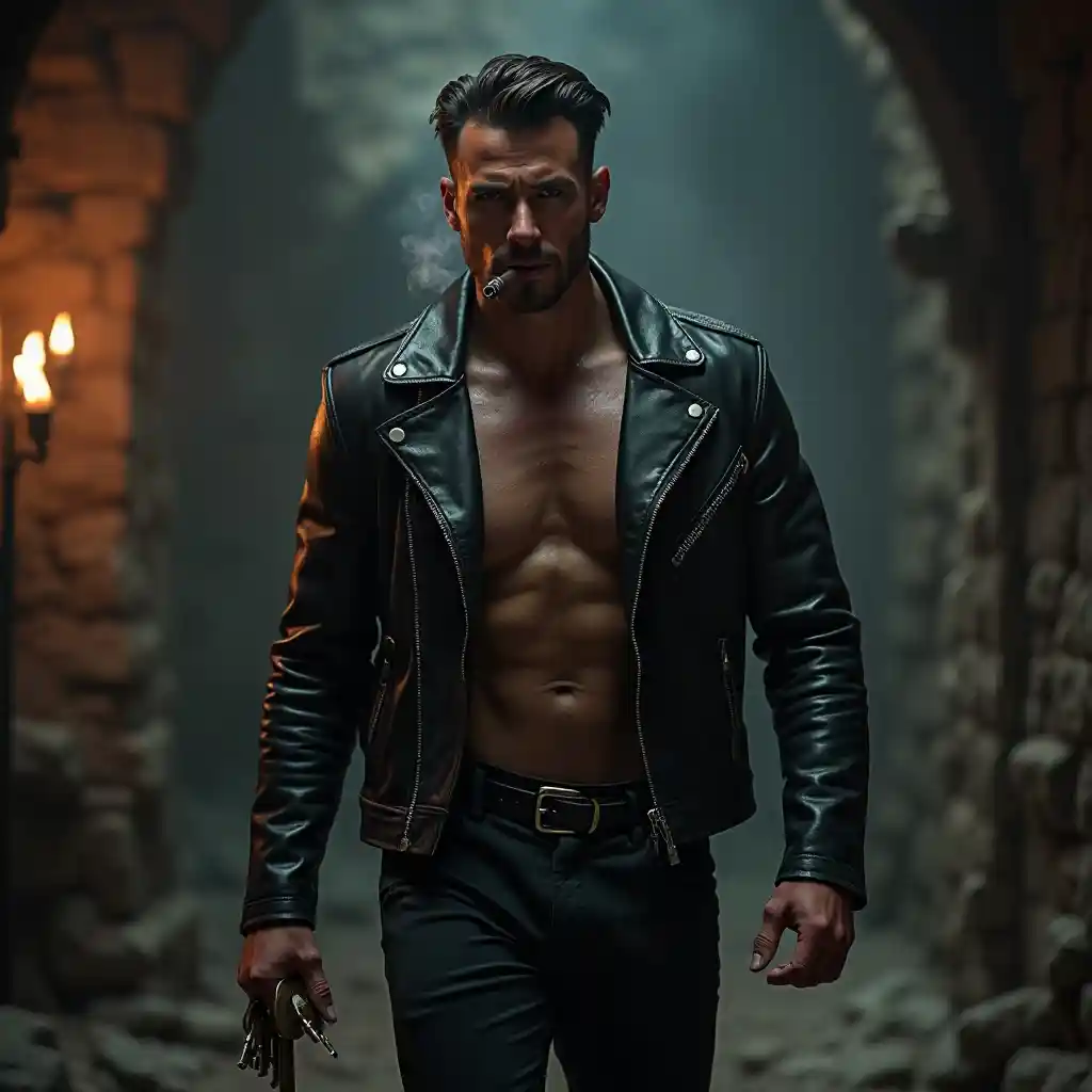 Ultra-realistisch portret, ruw knappe man met gesneden kaaklijn en felle uitdrukking, bodybuilder figuur met gedefinieerde spieren, in nood zwart leren motorjack met zilveren rits, strakke zwarte leren broek, zelfverzekerd door middeleeuwse stenen kerker lopen, hangende vintage messing sleutels in de rechterhand, Cubaanse sigaar met gloeiende gloed in de linkerhand creëren atmosferische rook, dramatische cinematische verlichting met oranje zaklamp werpen lange schaduwen, volumetrische mist, donkere omgeving, diepte van het veld, deskundige compositie, 8k UHD, fotorealistische weergave, donkere fantasie esthetiek, hoog contrast, randverlichting, ingewikkeld, professionele fotografie, humeurige sfeer, trending artstation