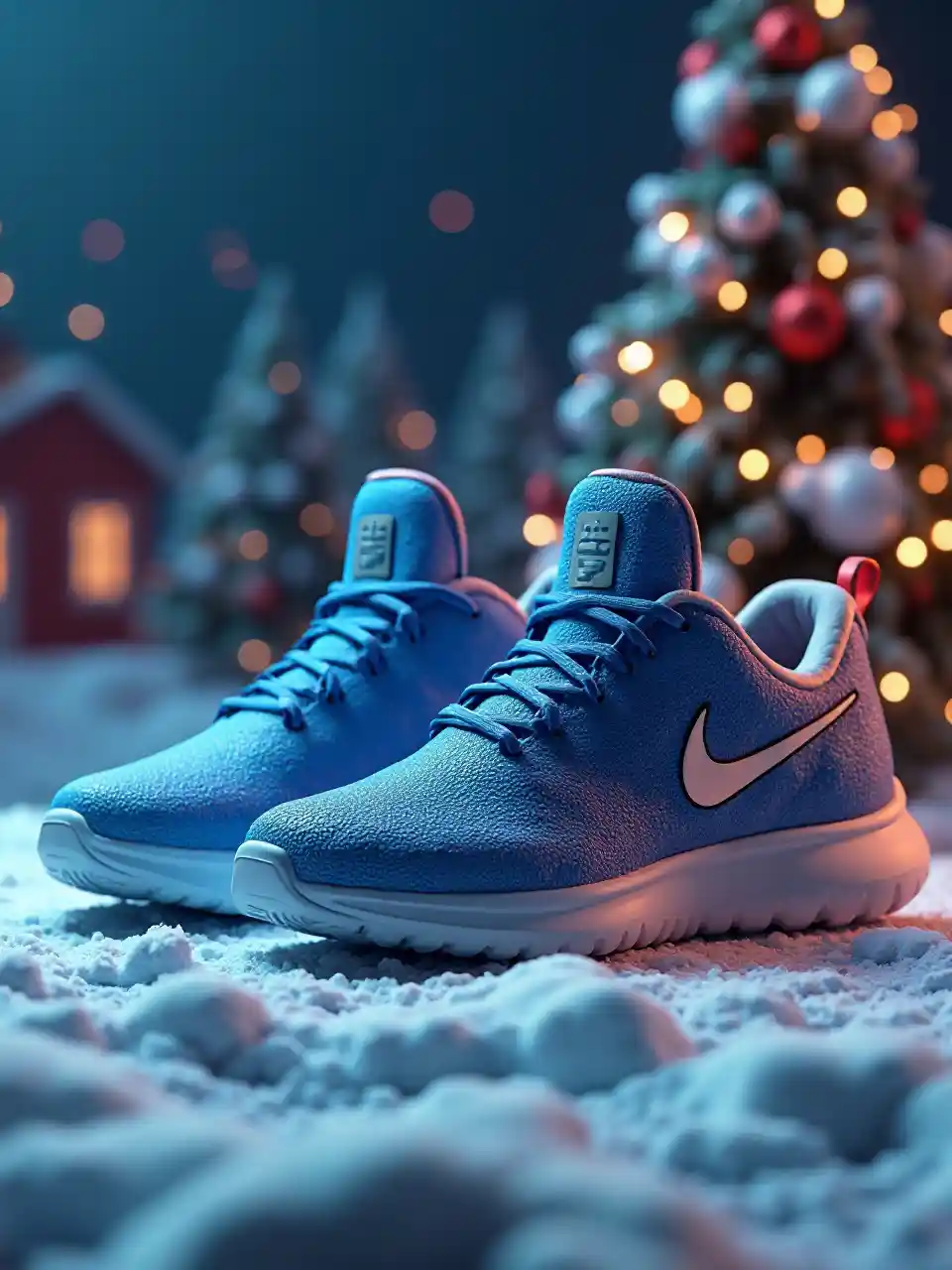 Luna3D-sneakers, van Nike, ontworpen voor de Kerstman, geavanceerde kleur blauw, hoge details, studio verlichting, kerst achtergrond, 8k UHD, C4D, blender, OC rendering.
