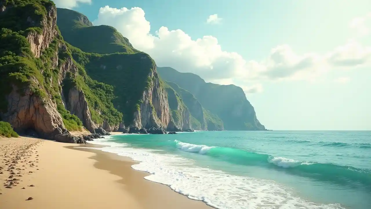 Aan de horizon strekt zich een rustige kustlijn uit, waar zachte golven ritmisch tegen een zand strand kruisen, waardoor een rustgevende sfeer ontstaat. Hooggebouwde kliffen, weelderig van groen en bekroond met plekken bruine rots, rijzen majestueus uit het water, in scherp contrast met het rustige blauwe van de oceaan. De lucht is versierd met zachte, pluizige wolken verspreid over een bleke achtergrond, die een zachte bries en helder weer laten zien. Het toneel geeft een sfeer van vreedzame afzondering, die uitnodigt tot overdenking en bewondering van de natuur. Het levendige kleurpalet van groene, blauwe en aardtonen vergroot het rustige maar dynamische gevoel van dit kustlandschap.