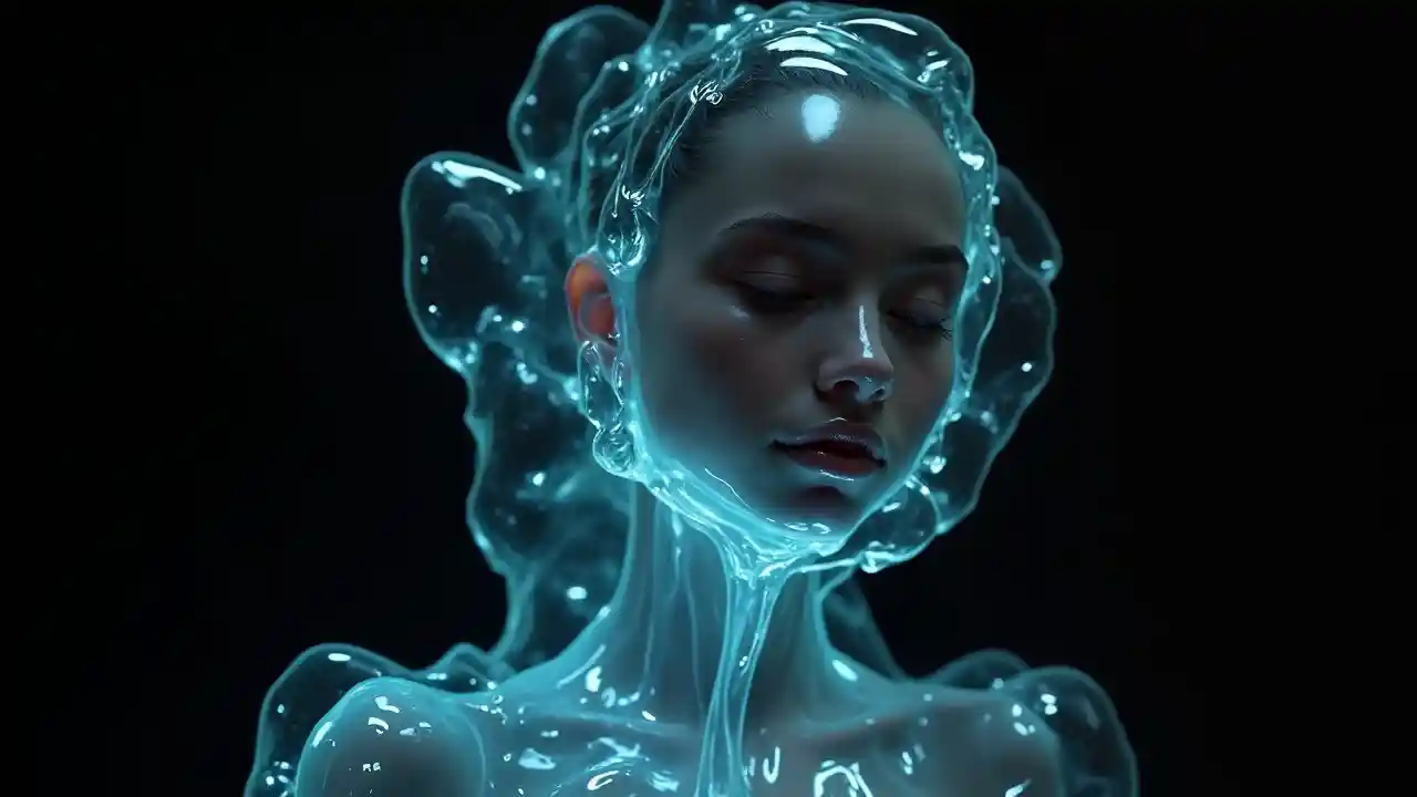 Kingstontranslucent slime girl, image in the style of Iris van Herpen, black background
