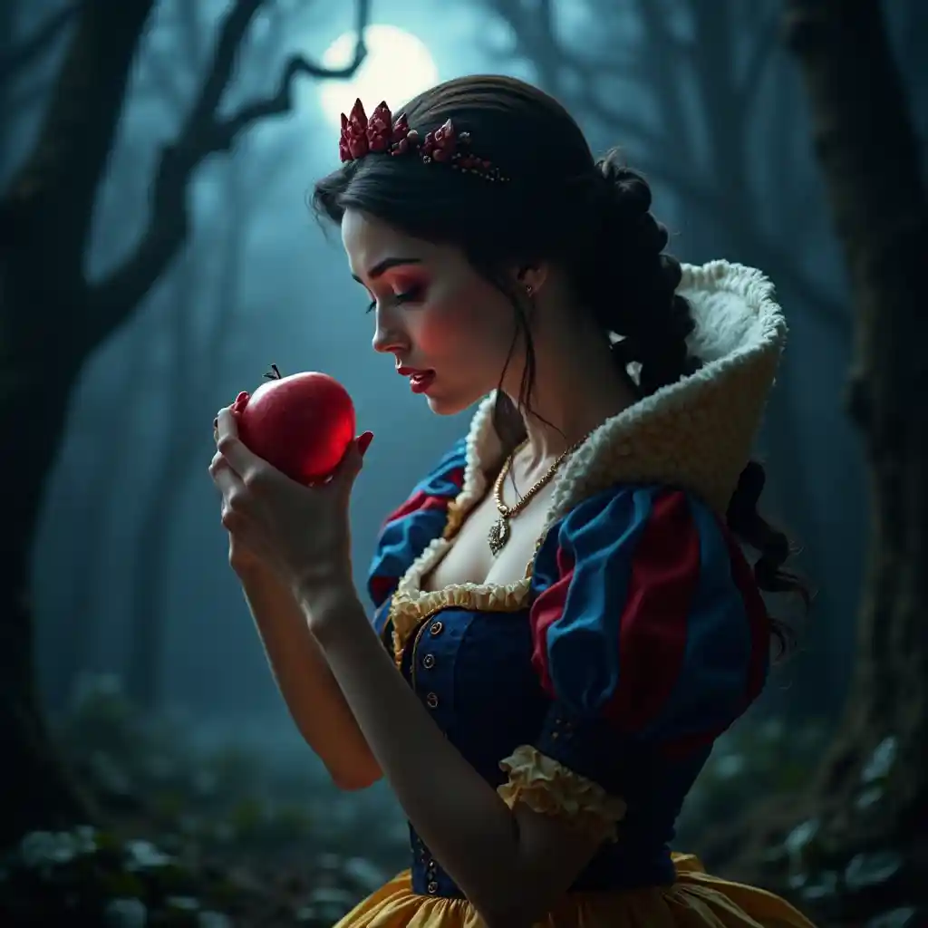 (Sneeuwwitje bijt de giftige appel), dramatische verlichting, donkere betoverde bos achtergrond, (smoeilijke sfeer), diepe schaduwen, mysterieuze mist, helder maanlicht filteren door bomen, levendige rode appel, zeer gedetailleerde gezichtskenken, koninklijke jurk met rijke kleuren, realistische stoffen texturen, ultra gedetailleerd, 4K.