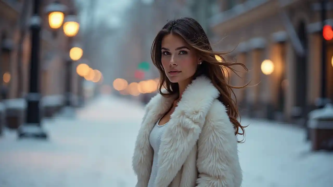 Stel je een beeld van een mooie vrouw in een luxe witte bontjas, die in de schemering op een besneeuwde straat staat. De zachte gloed van de straatlichten werpt een warm licht op haar figuur, en de bont accent haar bochten, waardoor ze zowel elegant als sensueel. Haar lange haar wordt door de wind weggevaagd en haar blik is sterk en zelfverzekerd als ze het besneeuwde landschap tegemoet ziet, het belichaamen van zowel schoonheid als kracht.