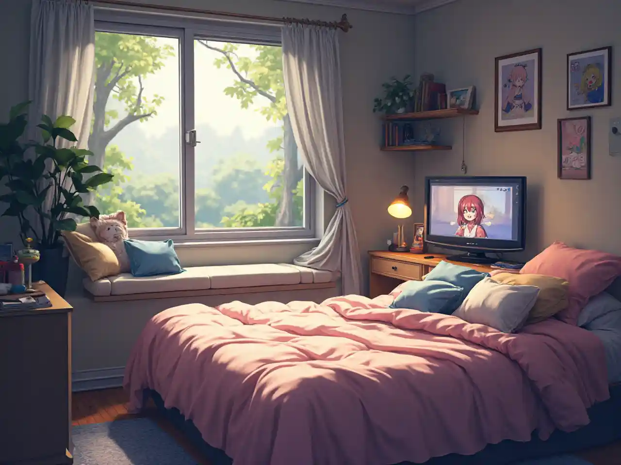 Een slaapkamer van een student met een bureau dat is uitgerust voor het streamen van video's. Meisjesbedden met kussens en comfortabel dek. Een groot raam dat een glimp geeft van een tweede verdieping en een onzichtbare tuin - daar een zitje bij het raam. Er zijn een paar opgezette spullen en glimpjes van anime favorieten niet te onderscheiden.