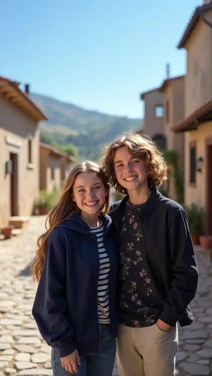 Onder een heldere blauwe lucht staan twee vrienden dicht bij elkaar op een geplaveide weg omgeven door rustieke gebouwen, met glooiende heuvels op de achtergrond die een rustige plattelandsomgeving suggereert. Het meisje, met een marine-hoodie en gestreepte top, straalt helder uit terwijl ze met de jongen poseert, die gekleed is in een patroon heeft, een zwart hemd en een lichte broek, met zijn hand gemakkelijk in zijn zak gestoken. Hun uitingen geven warmte en kameraadschap over, en ze vangen een moment van vreugde vast tegen de achtergrond van een zonnige dag. Het zachte zonlicht maakt de aardse tinten van de omgeving duidelijk en vergroot de uitnodigende sfeer van hun zorgeloze dag. De afbeelding roept een gevoel van vriendschap op en verkenning in een pittoreske omgeving.