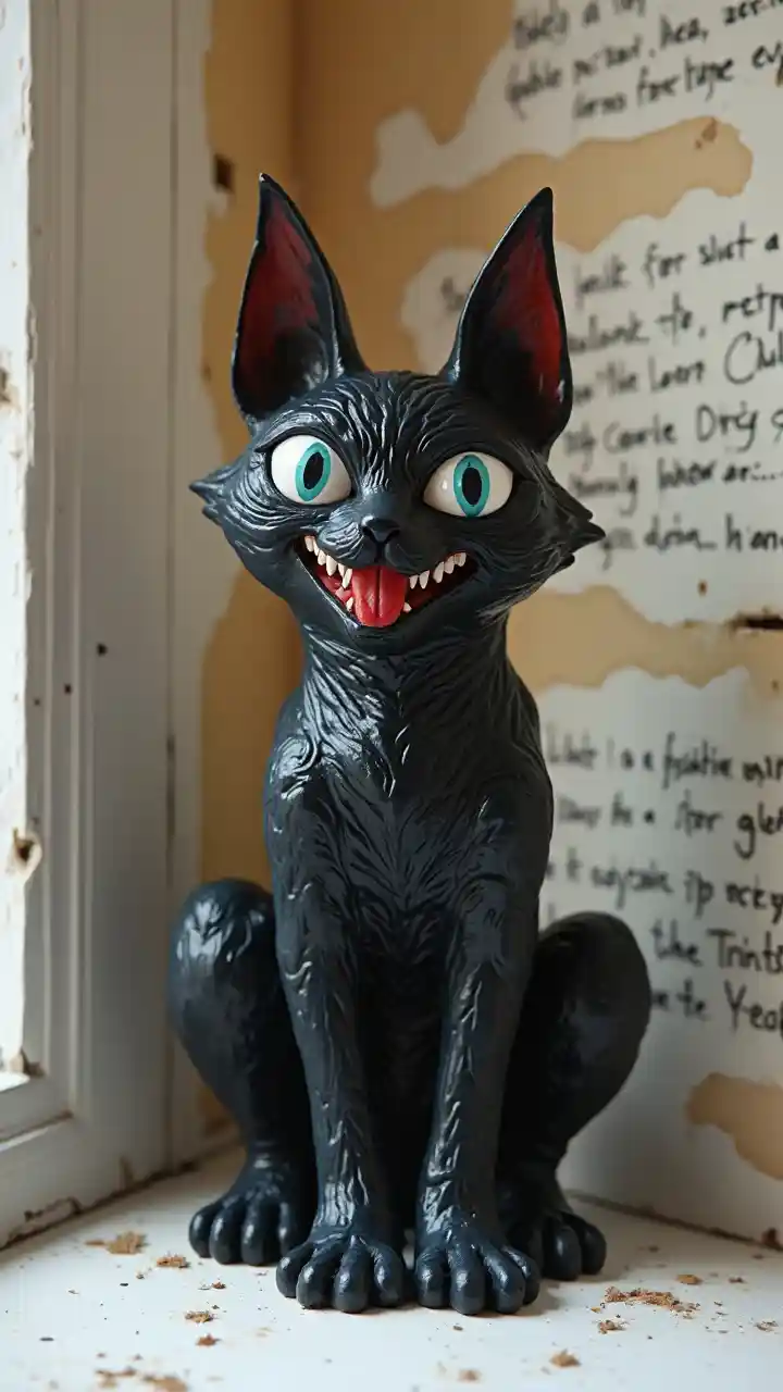 Een zwarte kat met blauwe ogen en een rode tong op een wit oppervlak met een bruine achtergrond en een witte muur, een beeldje, een surrealistisch beeld. De gezichten moeten glimlachen en boze wenkbrauwen. Er moet geschreven zijn uit de Bijbel geschreven in verf over de muren van de kamer