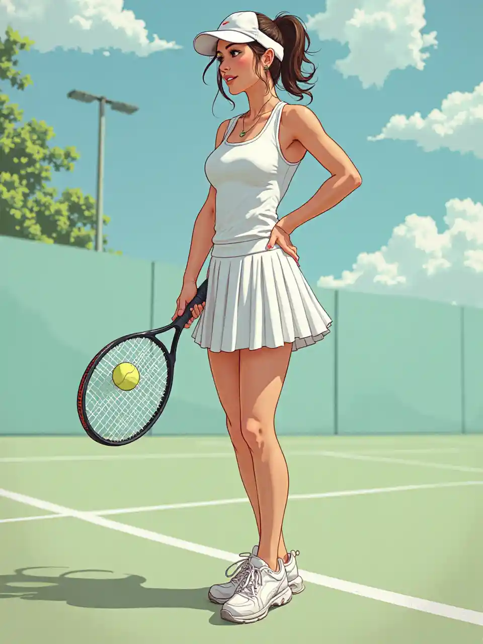 AidenIllustratie van een vrouw in een tennis outfit met een racket op een veld.