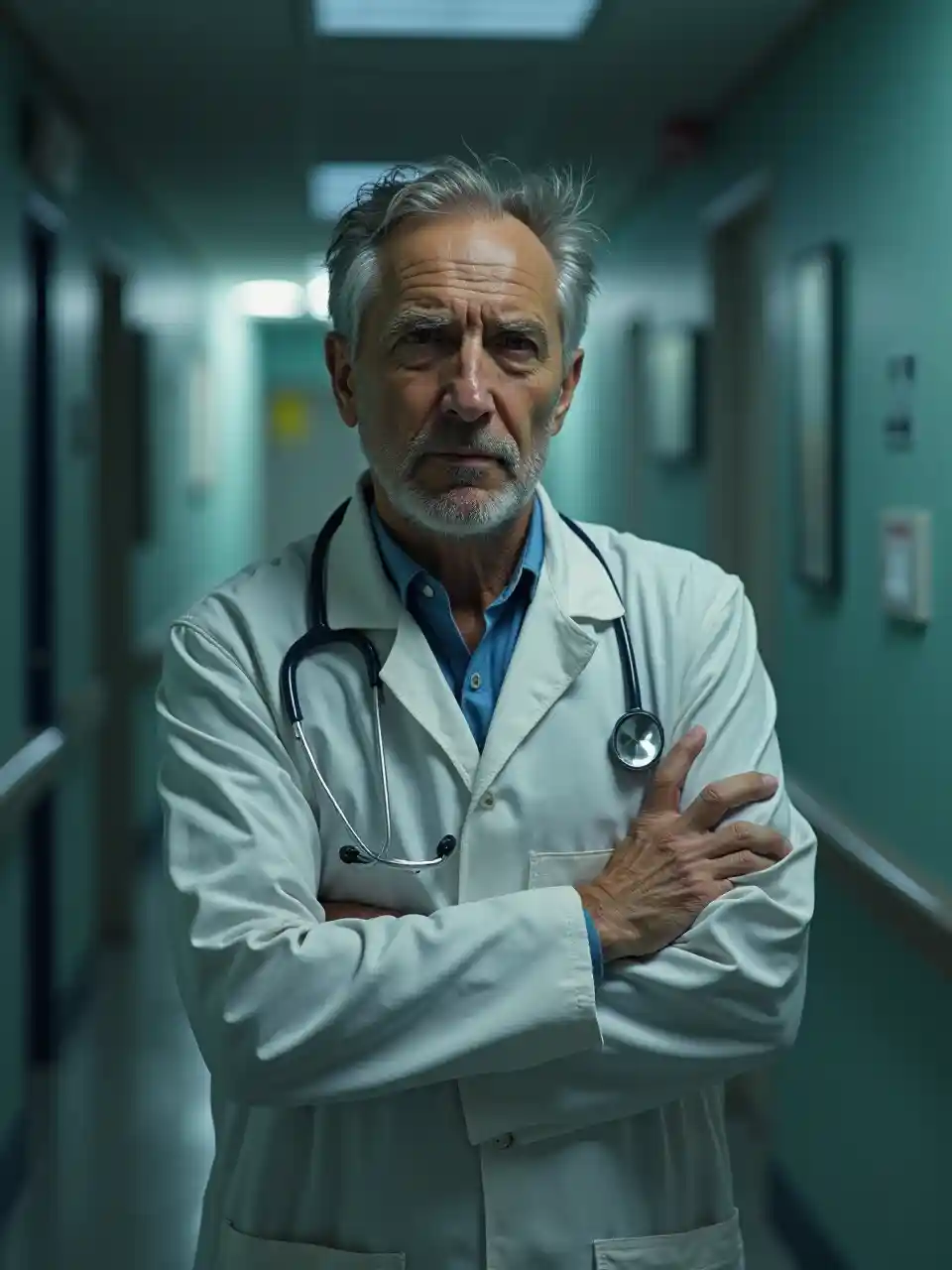 een zeer vermoeide veertigjarige huisarts, met een oud gezicht, in een vuile witte jas, ongemotiveerd, die nachtdiensten voor de ingang van een groot ziekenhuis