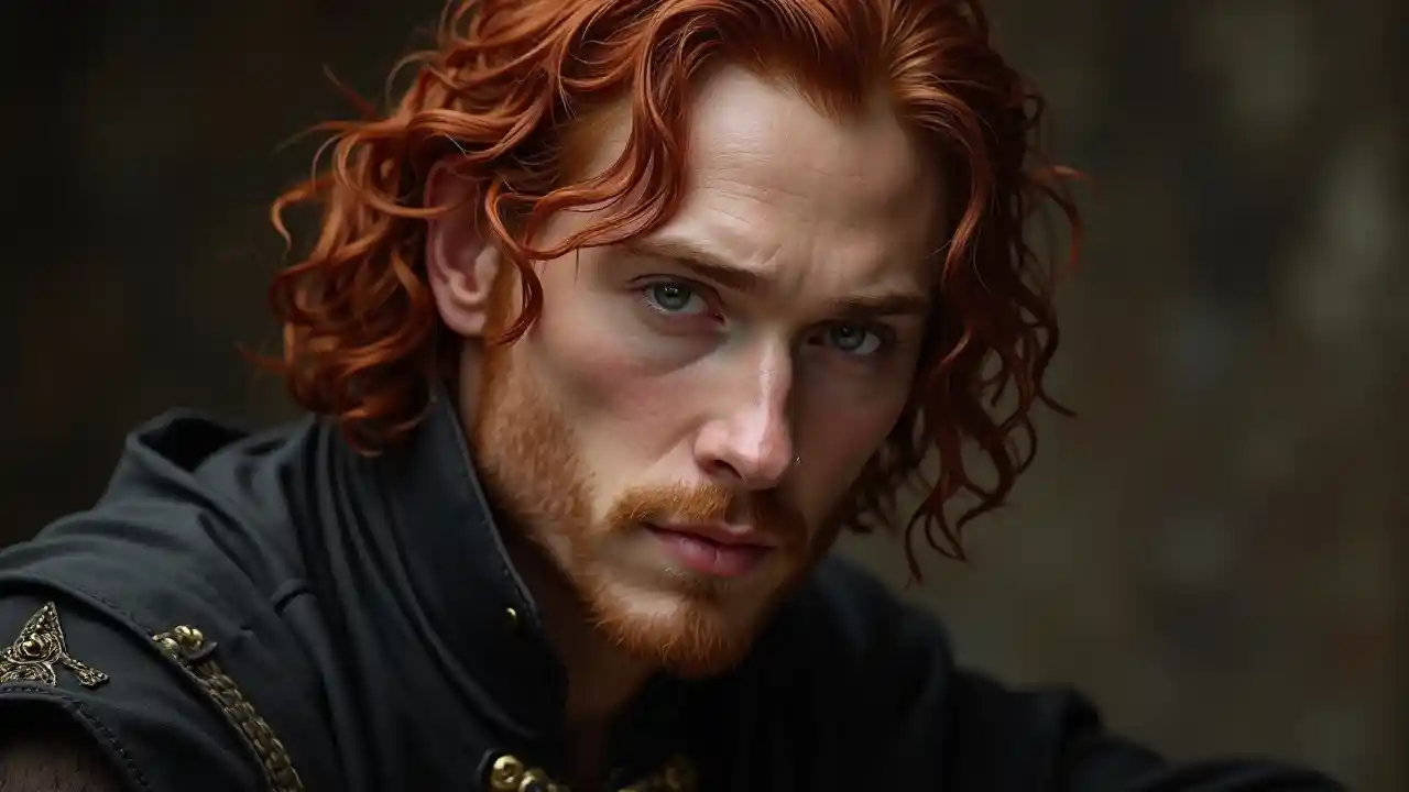 AudreyPortret van Tom Hiddleston met rood haar in middeleeuwse stijl, gedetailleerd gezicht, contrasterend licht