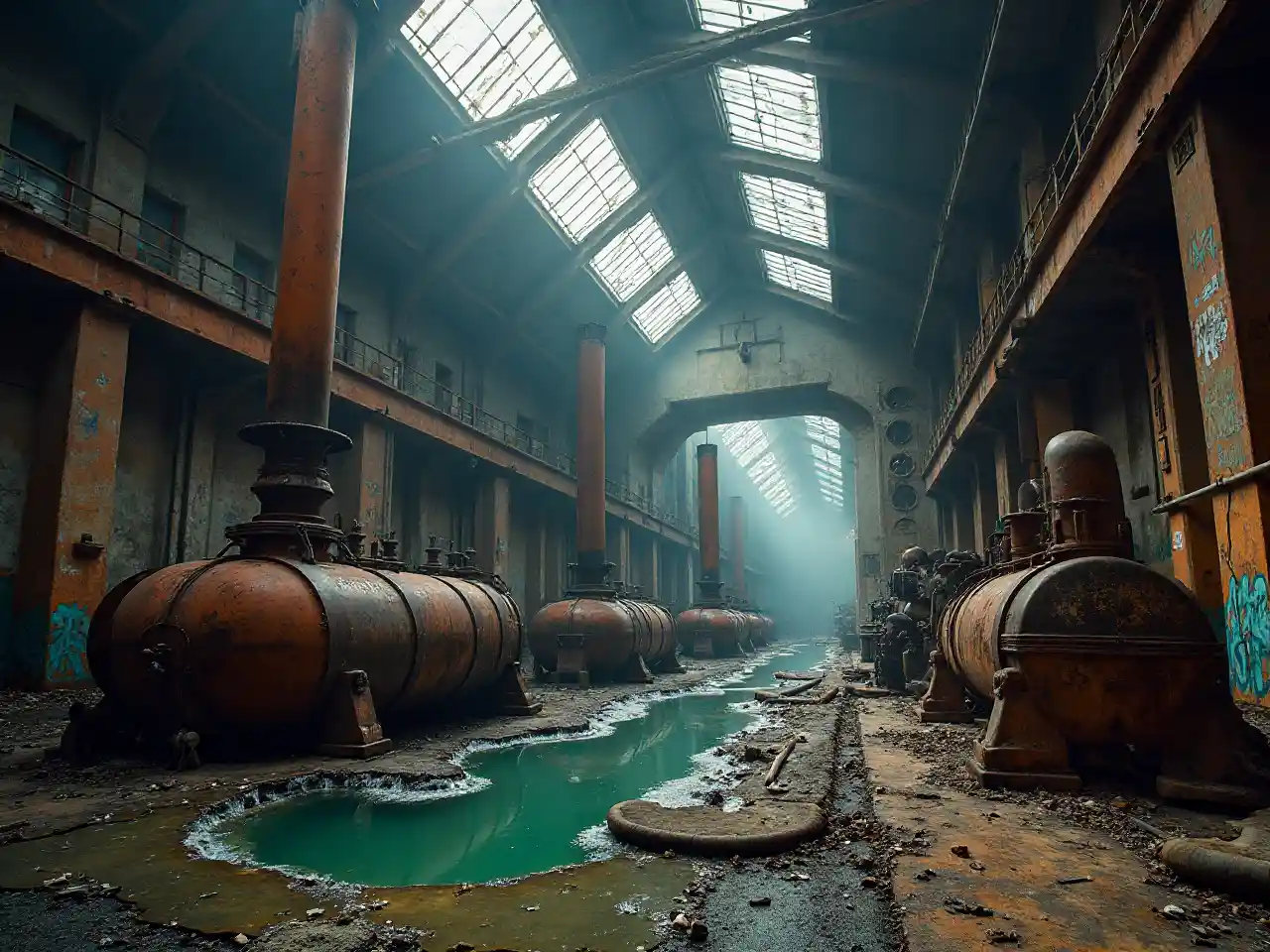 Urbex stijl. Een lekke roestige vat vol met lekke roestige chemicaliën in een steampunk boilerpunk fabriek. Het lijkt op een industriële kathedraal met veel buizen, bruggen. Reusmachines met ventilatoren en dieselmotor in het midden. Post-industriële verval. Post-apocalyptisch interieur. Achtergrondlicht dat door een glazen dak filtert. Puin, vuilnis en graffiti. Grote oppervlakte van water met reflectie. HDR. 8K. Bekroonde fotografie, te exposeren in internationale galeries. - Het is Hasenblad.