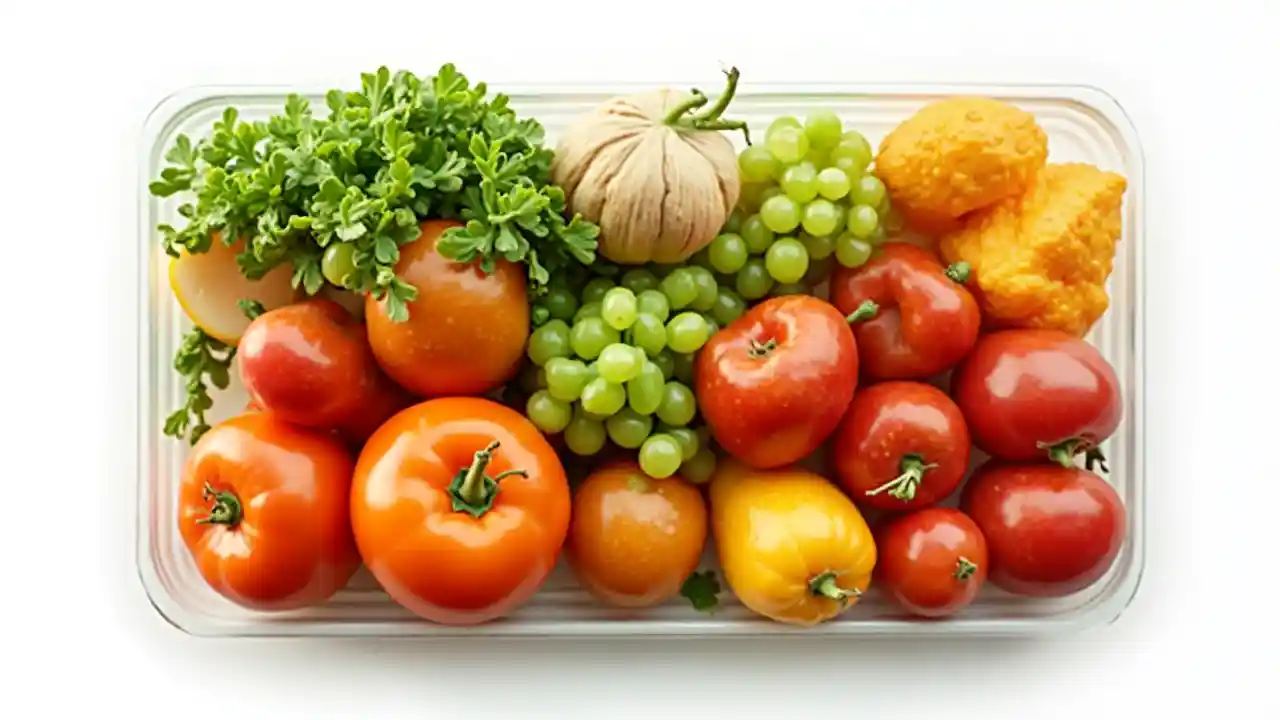 groenten in een doorzichtig plastic dienblad, van bovenaf, geïsoleerd, model