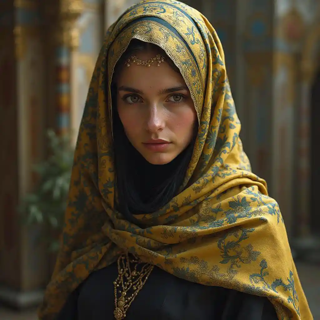 Het ontwerp van een vrouw met een sluier in de vorm van een schilderij omheen gewikkeld en staande in het heiligdom van Imam Reza