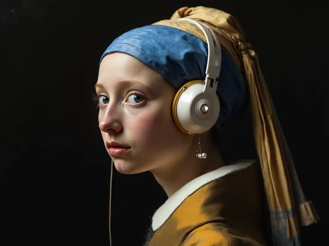 Herstellen van het klassieke schilderij van Johannes Vermeer, 1665, Het meisje met de parel oorbel, plaats een parel gekleurde futuristische koptelefoon op het meisje, chiaroscuro verlichting, zeer gedetailleerd, 8K, zeer zachte pastel warme kleuren