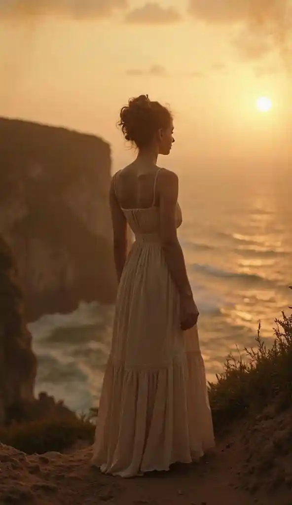 Vintage Sepia Foto van Vrouw bij Zonsondergang