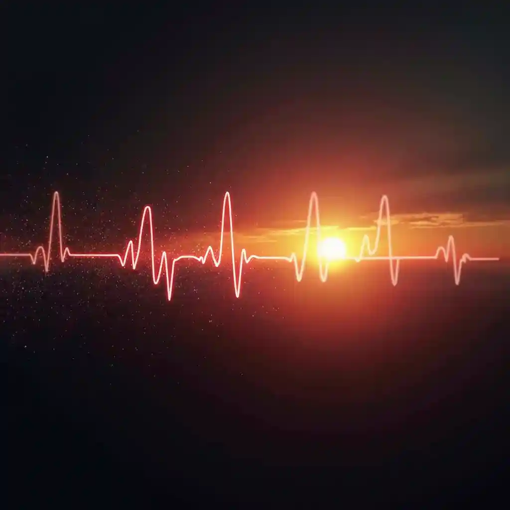 Dia 5 De wake-up call Een dramatisch beeld van een hartslagmonitorlijn (EKG of ECG) die in een heldere horizon overgaat. Het symboliseert een kritiek keerpunt en ontwaken. Hoge contrasten, emotionele impact.