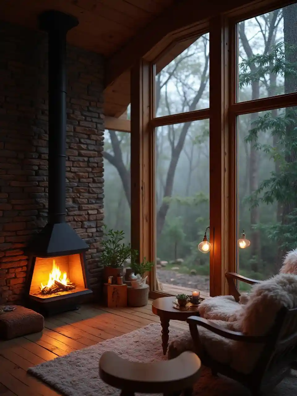 warm gezellig mooi decor houten huis, buiten regent raam, open haard binnen