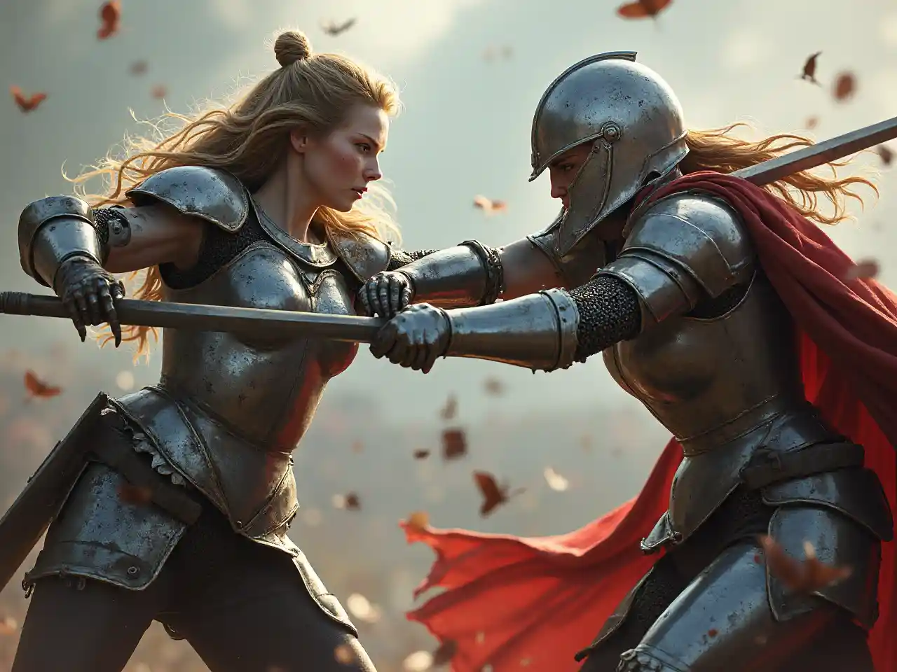 2 sterke vrouwelijke krijgerridders, botsen in de strijd, de vrouw aan de linkerkant is in een opvallende houding met haar zwaard in haar rechterhand, het maken van een grote swing naar de vrouw aan de rechterkant. Haar schoonheid is ongeëvenaard. Haar gezicht is zwarte, maar nog steeds elegant en sterk. Ze heeft kleine wonden hier en daar, maar niets te ernstig, want haar schoonheid schijnt. De rechter ridderin verwacht de grote schommel en neemt een lagere houding met een speer in de hand, hoewel ze geen harnas heeft, past de rechter ridderin bij de linker ridderin als haar houding van anticiperen en voorspellen om de aanval van haar vijand te weerstaan. De lichamen van beide ridders brengen de goden van het pantheon in verlegenheid, omdat ze er prachtig uitzien in de strijd en hun glorie van hun botsing wordt gevangen in dit moment. De stijl is hyperrealistisch, vermijdt anime of stripboeken esthetiek. Focus op een grondige, realistische voorstelling van het personage en de omgeving.