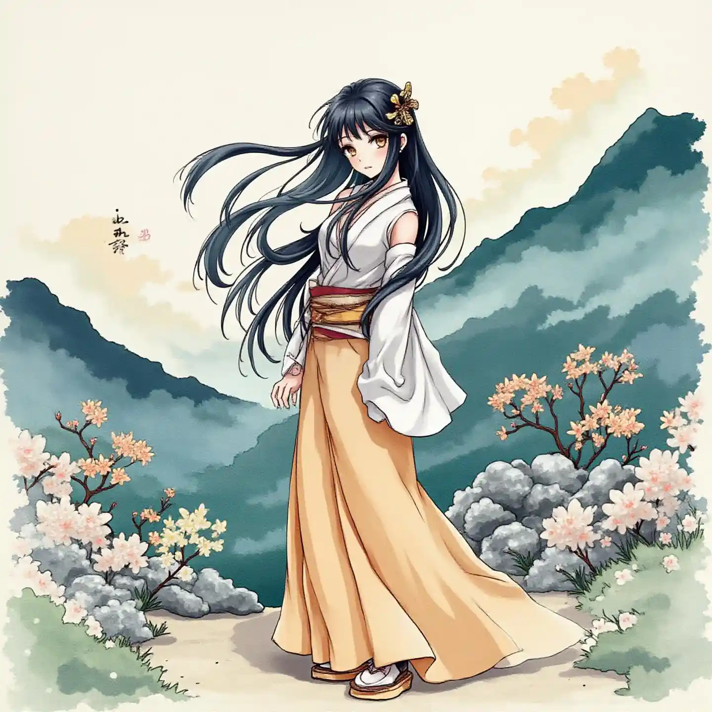 SebastianEen waterverf-afbeelding van een mooie Japanse vrouw met lang, stralend zwart haar, die sierlijk in het midden van de bergen van Japan staat, omringd door fa