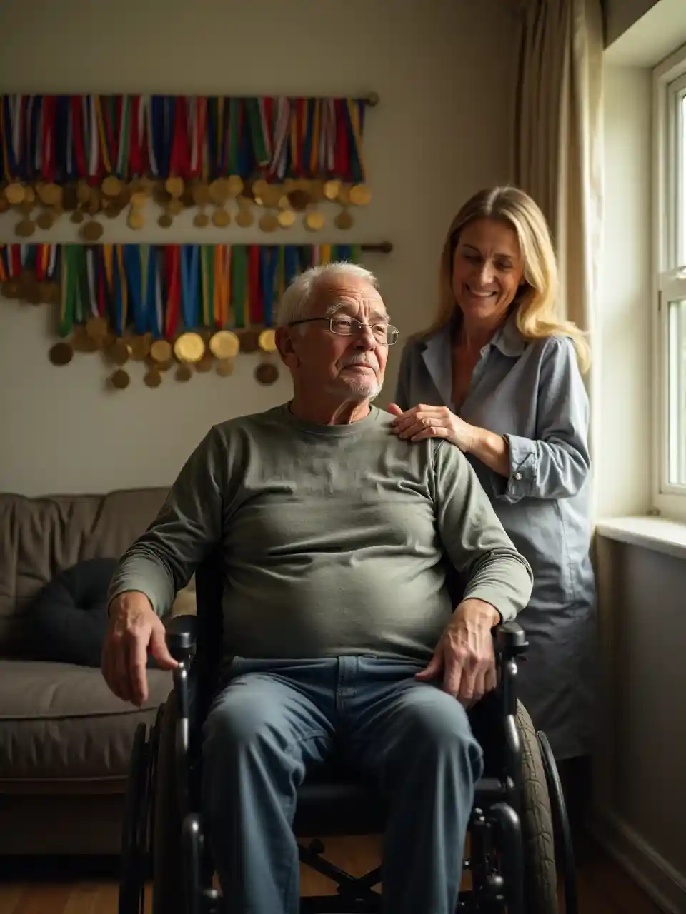 In een zacht verlichte, gezellige woonkamer zit een man in zijn rolstoel, met een vastberaden blik op zijn gezicht. Zijn vrouw staat naast hem, haar hand op zijn schouder, en straalt onwrikbare steun en liefde uit. Aan de muur staat een plank met tal van medailles en onderscheidingen, een bewijs van zijn kracht. Deze ene filmbeeld belichaming van veerkracht in tegenspoed, toont de strijd van de man in de rolstoel en de standvastige steun van zijn liefdevolle vrouw.