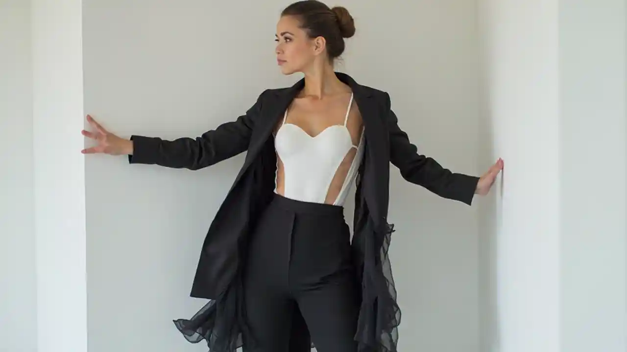 Stijlvolle zwarte smoking en mesh dans outfit