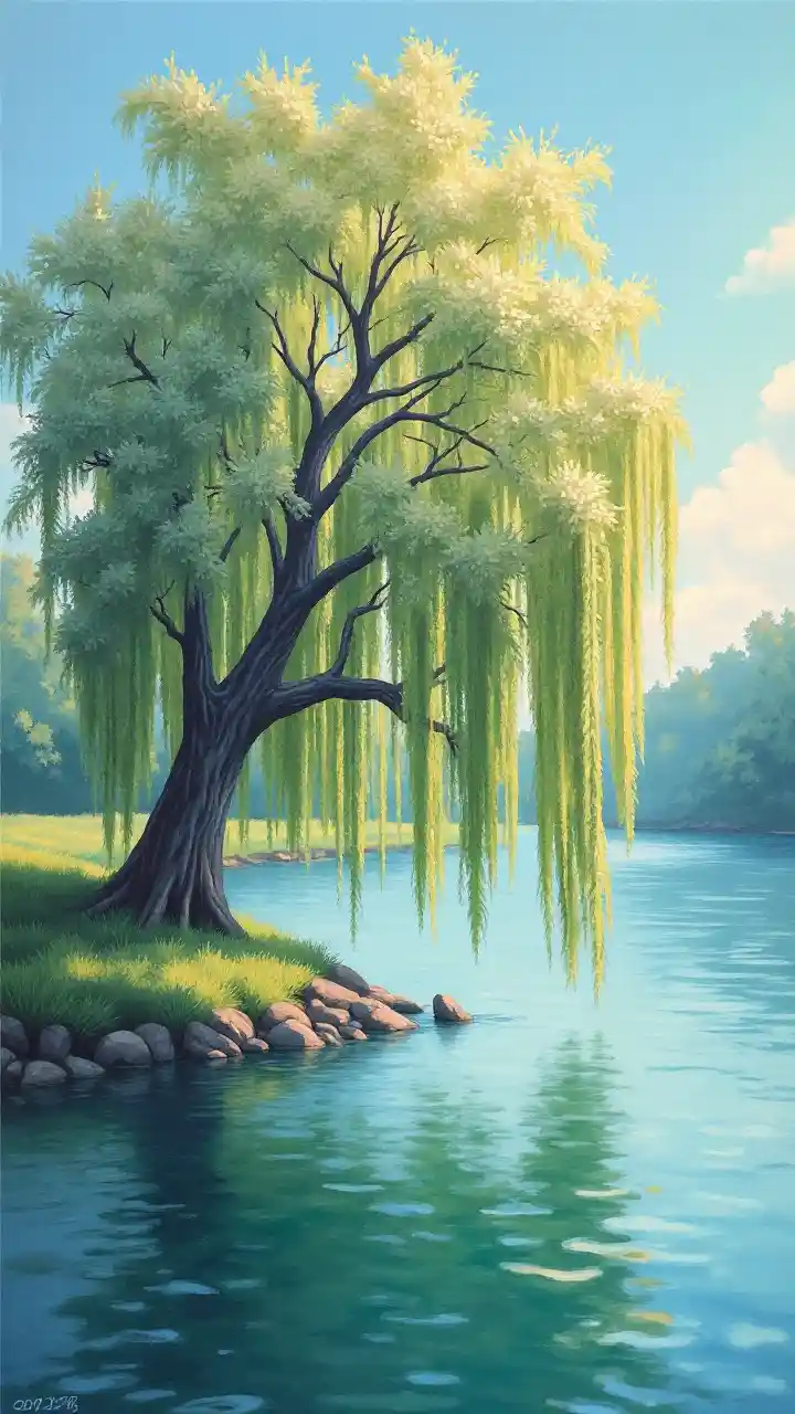 ((Willow Tree on the Niagara River, in early summer when the river is a deep greenish blue and with the early morning sun's light refracting across the tree's branches and casting a soft glow on the banks of the river)), depicted in an (((impressionist))) style, using ((soft pastel colors)) like ((light blue, pink, and pale yellow)) to convey a sense of tranquil winter ambiance. The ((riverbanks)) are lush and picturesque. The ((sky is bright and sunny)), with ((clouds swirling around the tree, casting ((light and shadows)) across the lush landscape. The tree's branches are ((swirling and gracefully moving with the wind, creating ((beautifully curved lines)) that frame the scene perfectly). The ((trees and the river)) should ((reflect off each other)), as if giving a sense of natural beauty and tranquility.