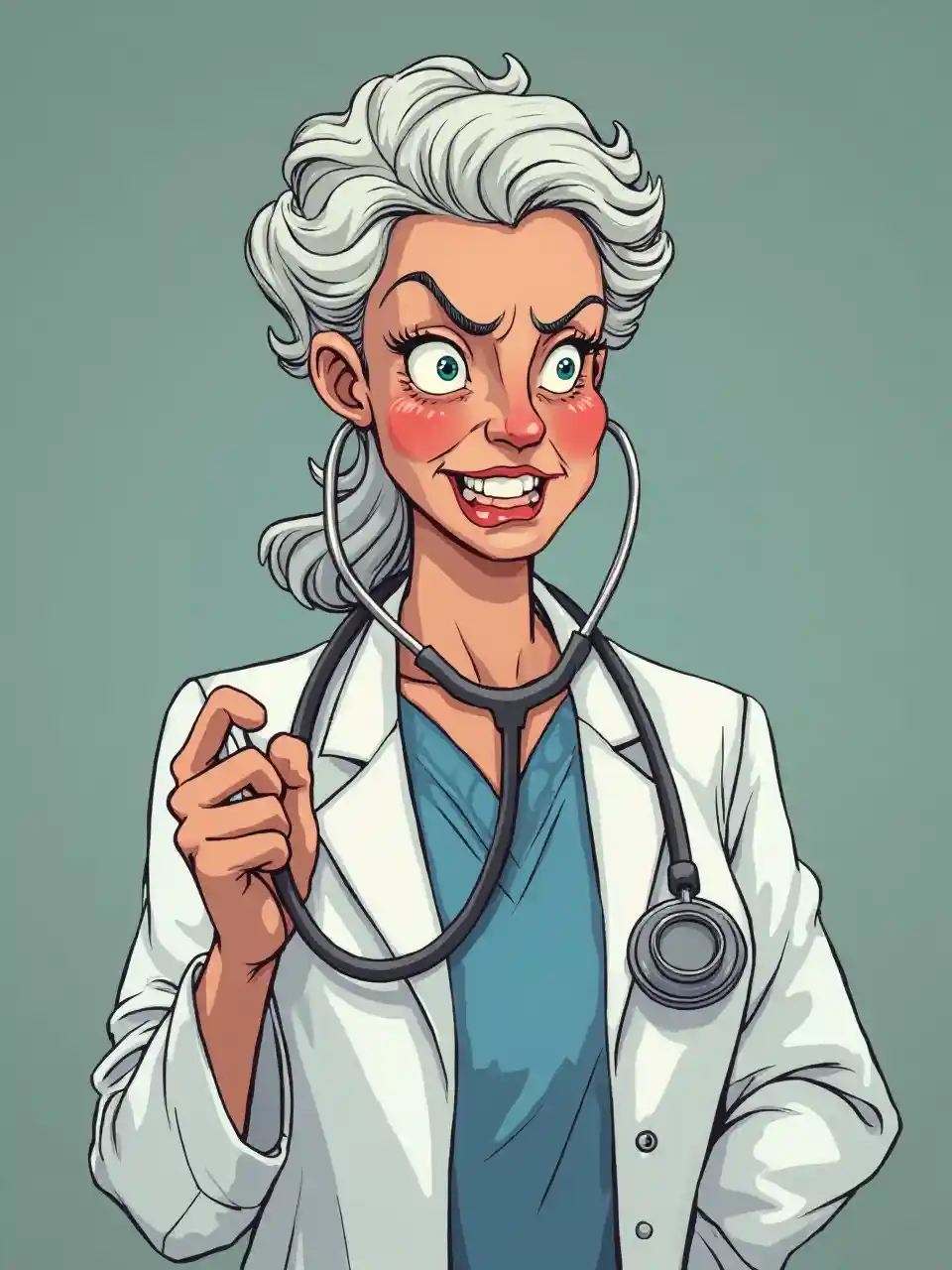 PenelopeEn illustrasjon av en sint eldre kvinnelig lege som holder et stetoskop.