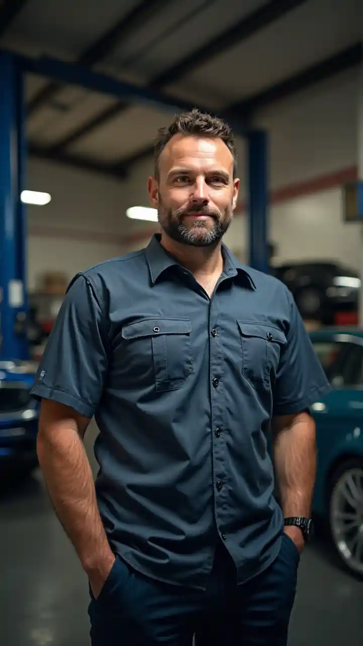 En mann i en mekaniker skjorte står i en bil garasje.