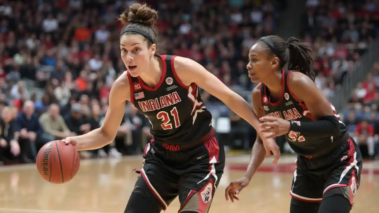 To kvinnelige basketballspillere på banen, en i en svart Indiana trøye dribbler, bevoktet av en annen spiller.