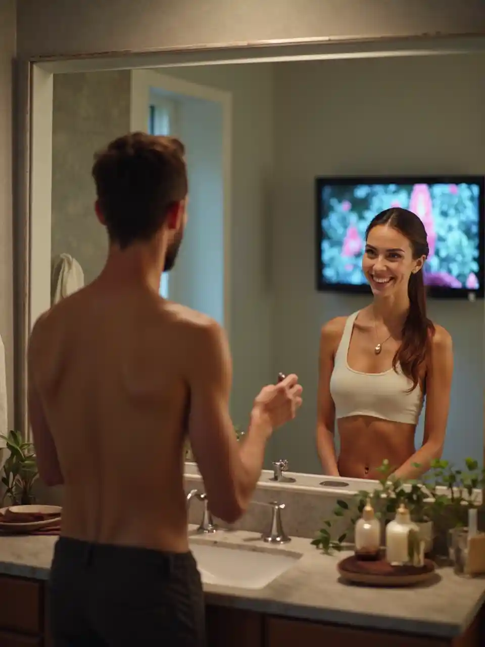Coopervakker mann og vakker kvinne ser på TV på badet