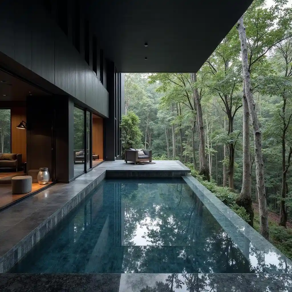 Lucasluksus moderne og klassisk interiørdesign matt svart n skogen med store vinduer og utsikt over uendelighetsbasseng