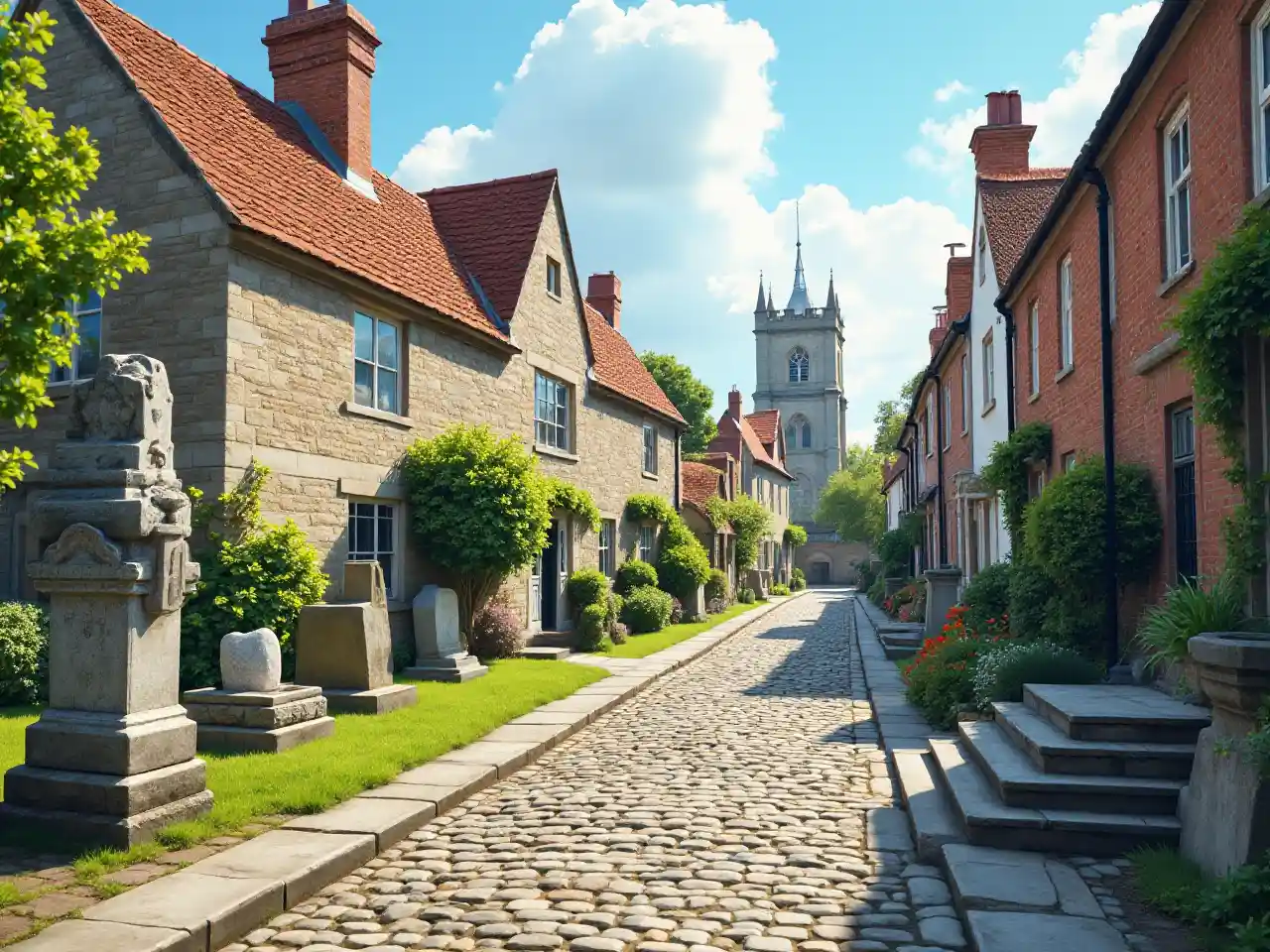 Lag et bilde av en gammel britisk by med eksempler på forskjellige steiner: en moderne betongbygning, en koselig og gammeldags murbygning, gravsteiner i en kirke, statuer, marmortrinn og en brostens gate. Inkludere trær og gjøre det en solrik dag.