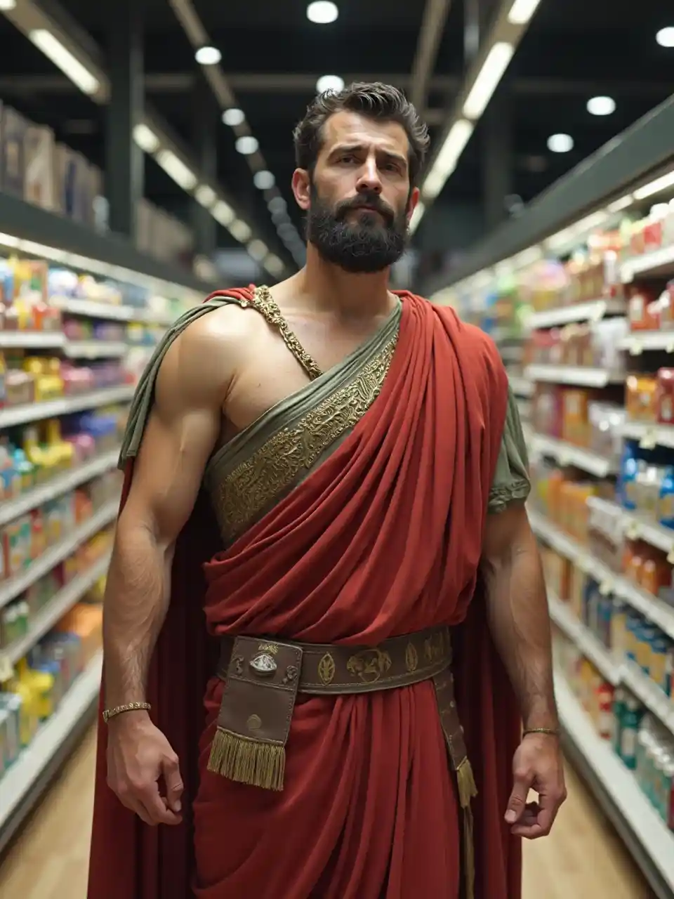 Julius Cæsar, den gamle romerske keiseren handler i et moderne supermarked. Han har ikke skjegg og overskjegg. Full kropp, medium skudd. Hyperrealistisk.