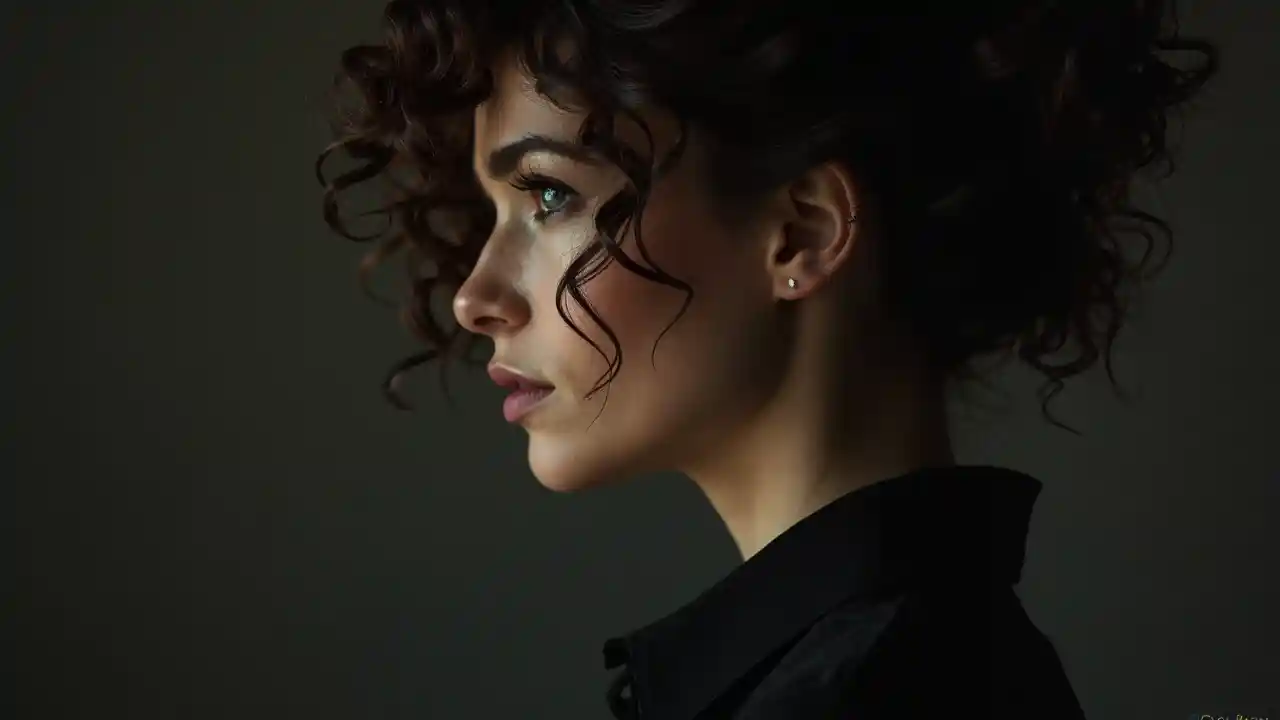 En brunett kvinne med krøllet hår i en svart topp og svart bluse, Carol Bove, gotisk kunst, profil, ansikt nærbilde