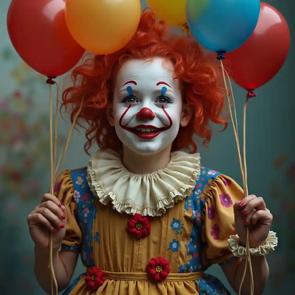 Jente har en klovn kostym, klovn ansikt holder ballonger, realistisk, storslått,