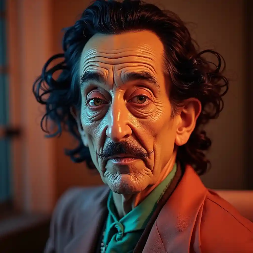 Portrett av Salvador Dali, lyse og mettet farger, elegant, svært detaljert, mote, mote, skarpt fokus, lys og uttrykkelig sminke, dramatisk belysning, dybde av felt, utrolig høy detalj, slur bakgrunnen