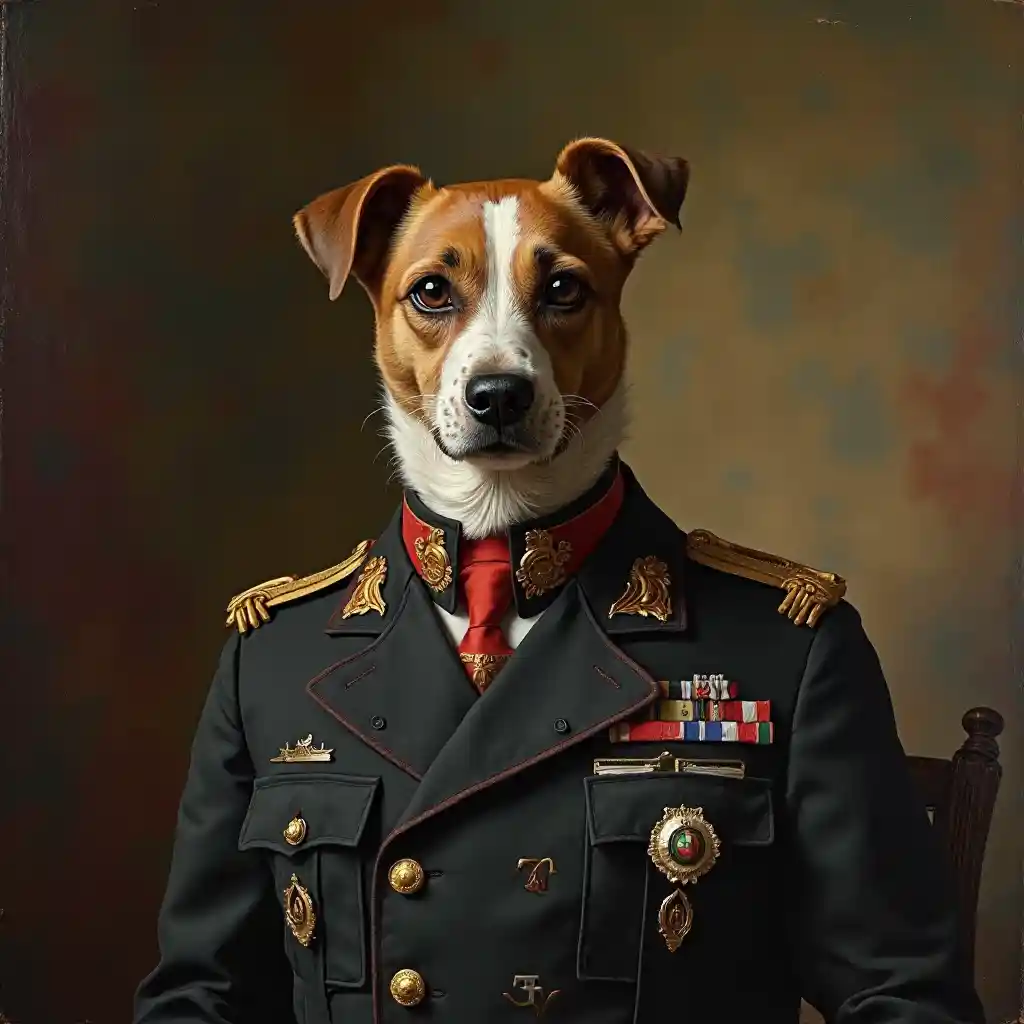 et oljeportrett av en hund kledd som en tysk general fra 1800-tallet